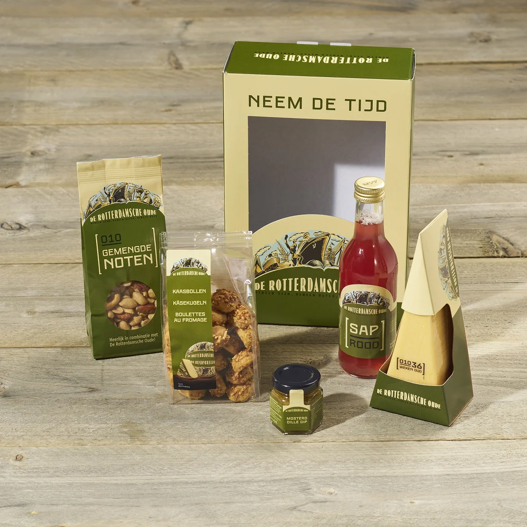 Beestachtig lekker borrelen! Dit pakket is een feestje voor elke borrelplank. Een romige kaas met karakter, knapperige kaasbollen, nootjes om niet van af te blijven en een dip die alles bij elkaar brengt. Schenk er wat Rotterdamsche sap bij en je hebt een borrel die z’n naam eer aandoet. Alles in dit pakket brult gewoon om gedeeld te worden — beestachtig goed, recht uit Rotterdam. Dit pakket is een origineel cadeau, verpakt in onze unieke De Rotterdamsche Oude verpakking en bestaat uit: